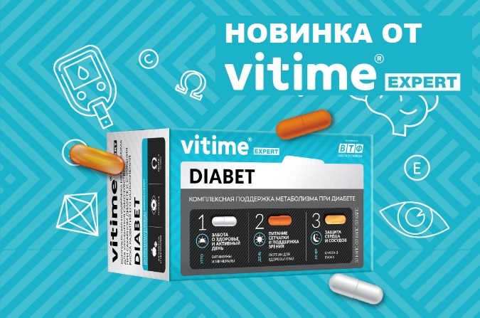 VITime Expert Diabet будет полезен тем, кто страдает сахарным диабетом и нарушениями углеводного обмена: в его составе витамины и минералы, лютеин для усиленной поддержки зрения, липоевая кислота, экстракт гинкго билоба и омега-3 ПНЖК.